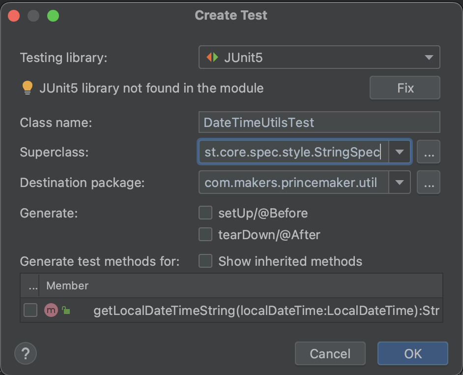 kotlin파일에서 cmd + shift + t 눌러서 테스트 코드 자동 생성 기능이 있습니다