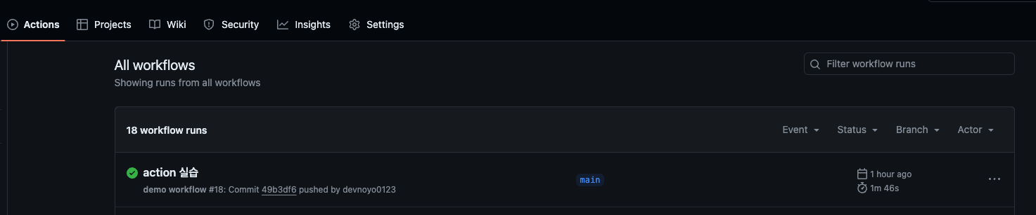 해당 파일이 github repository에 main 브랜치가 push가 되면 해당 repository의 actions 탭에 코드로 작성한 workflow가 동작하는것을 확인할 수 있습니다