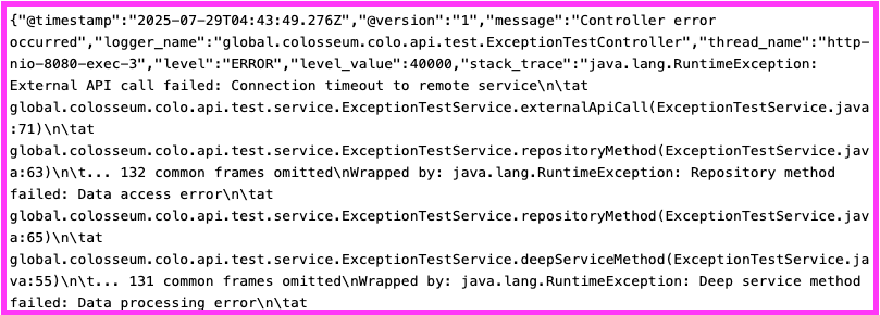 시스템 운영 로그를 관리하다 보면, 예외 로그의 StackTrace가 너무 길어져서 Logstash의 버퍼 크기를 초과하거나 스토리지 비용이 증가하는 문제를 겪게 됩니다. 특히 Spring Boot 애플리케이션에서 중첩된 예외가 발생할 때, StackTrace가 수십 줄에서 수백 줄까지 길어질 수 있습니다.