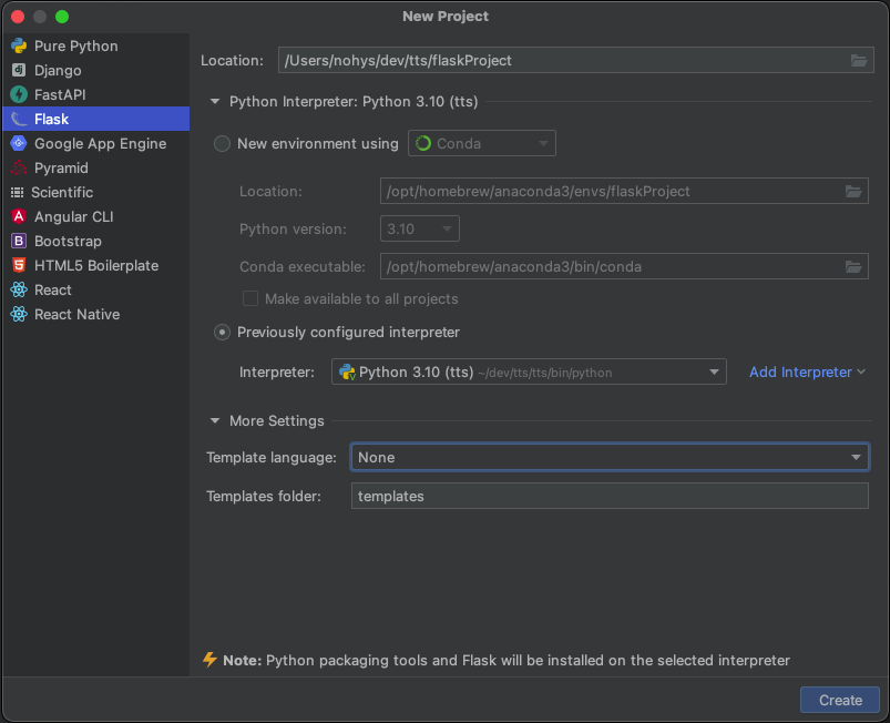 flask로 애플리케이션 새로 만들때 다음과 같이 이미 생성한 interpreter를 쓸 수 있습니다